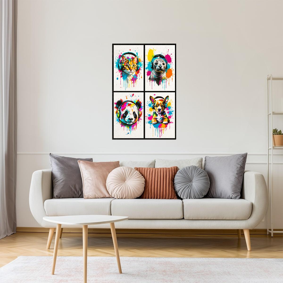Colorful Animals in Headphones Poster | Cat Seal Panda Puppy Collage Wall Print for Bedroom