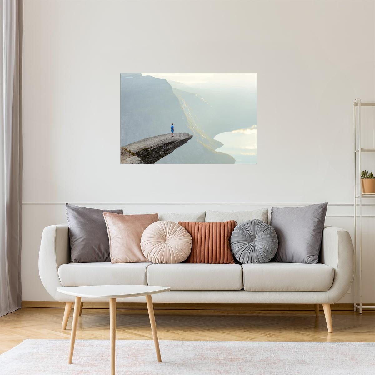 Hiker on Trolltunga Cliff Poster | Norway Adventure Photography | Scenic Landscape Wall Art