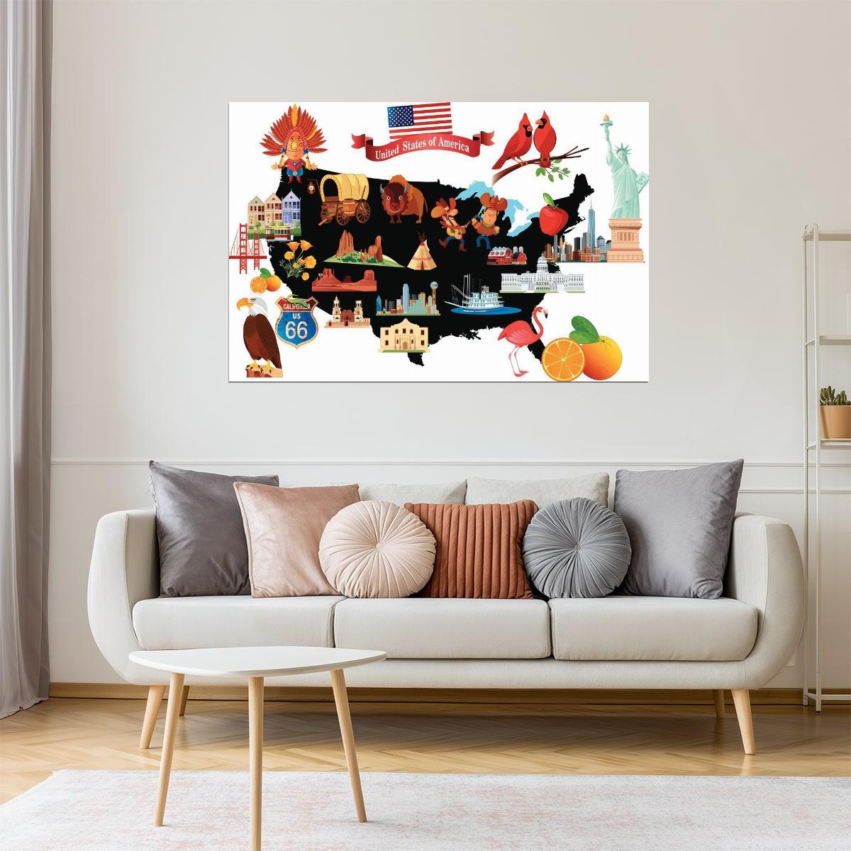 USA Map | Cartoon Illustrated Map with American Symbols Poster