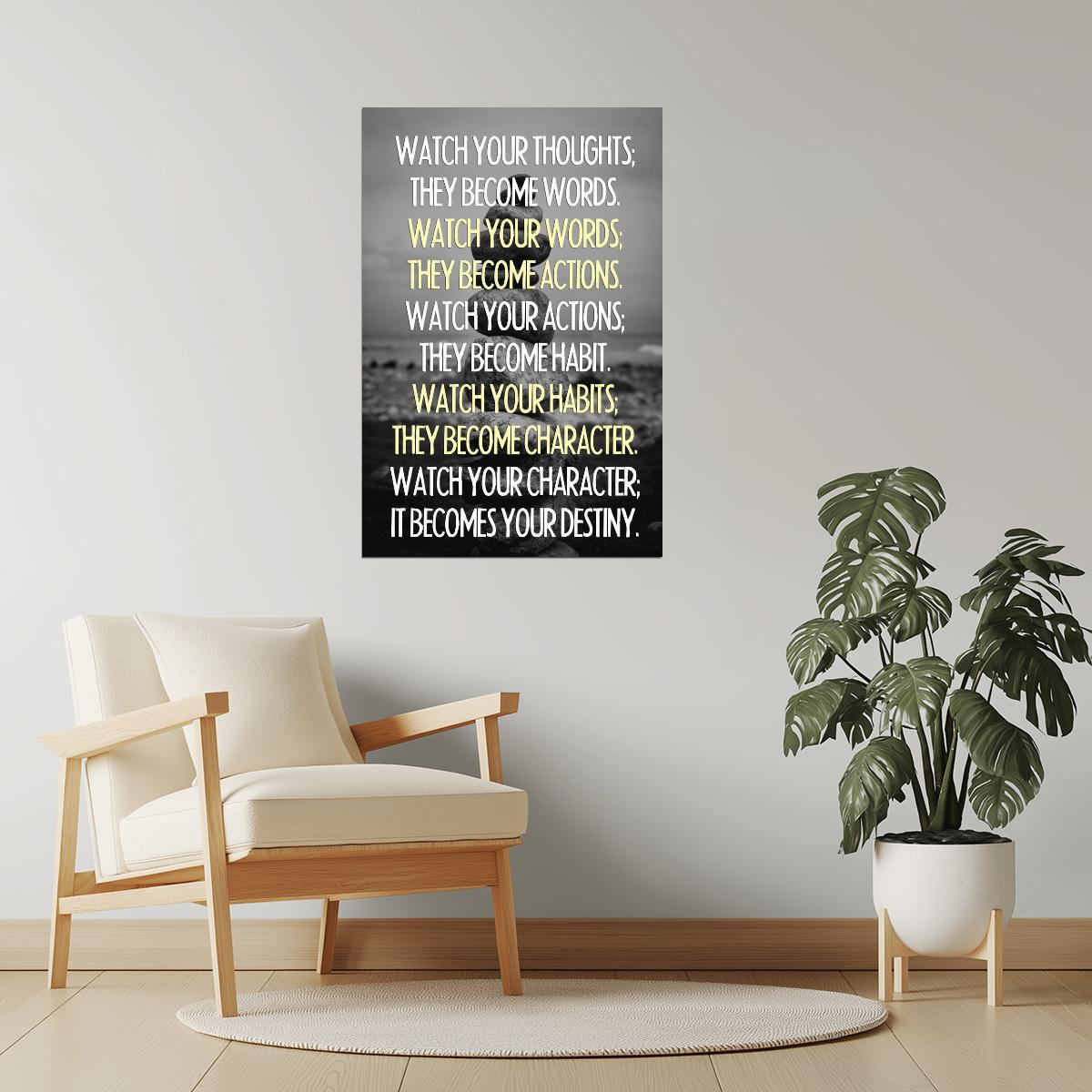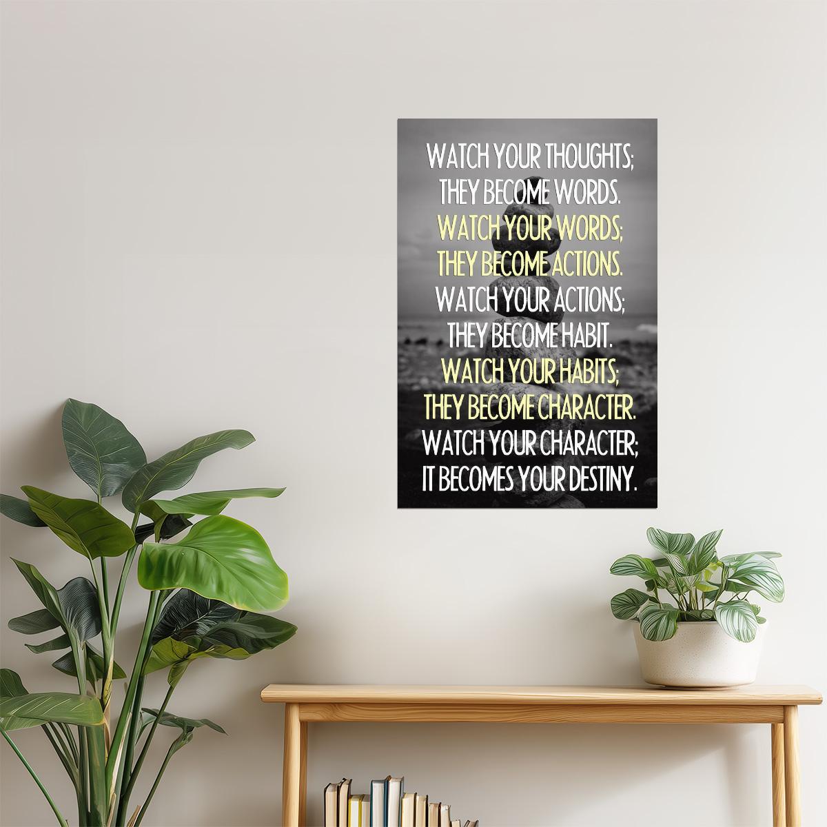 Our collection of quote posters and prints offers a wide range of styles, from trendy and modern to vintage and minimalist. These inspirational posters are perfect for creating a positive atmosphere in any space, from your home office to a dorm room. Watch Your Thoughts | Buddha Motivational Quote Poster is an ideal choice for anyone seeking a motivational reminder or a decorative statement piece.