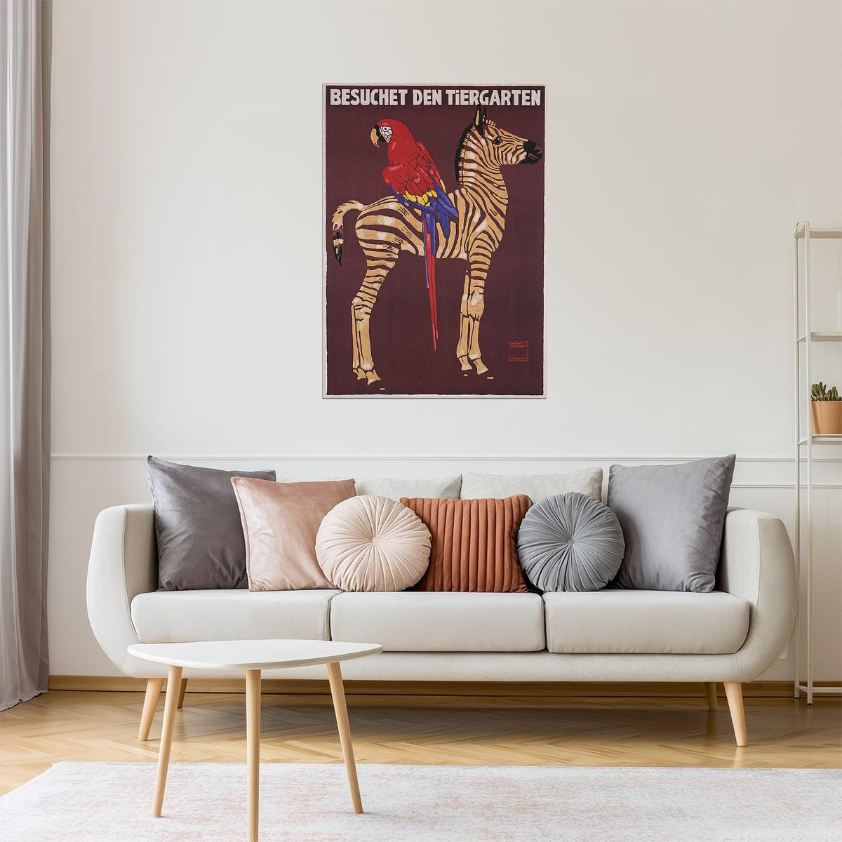 Find the perfect decorative piece for your home, office, or personal space. Our collection of retro posters and vintage wall art captures the aesthetic of past eras, from the swinging 60s to the bold 80s. This print is the perfect way to add nostalgia to your space. Zoo Visit | Vintage German Poster with Parrot and Zebra Illustration is more than just a poster, it's a piece of history that brings timeless style to your walls.